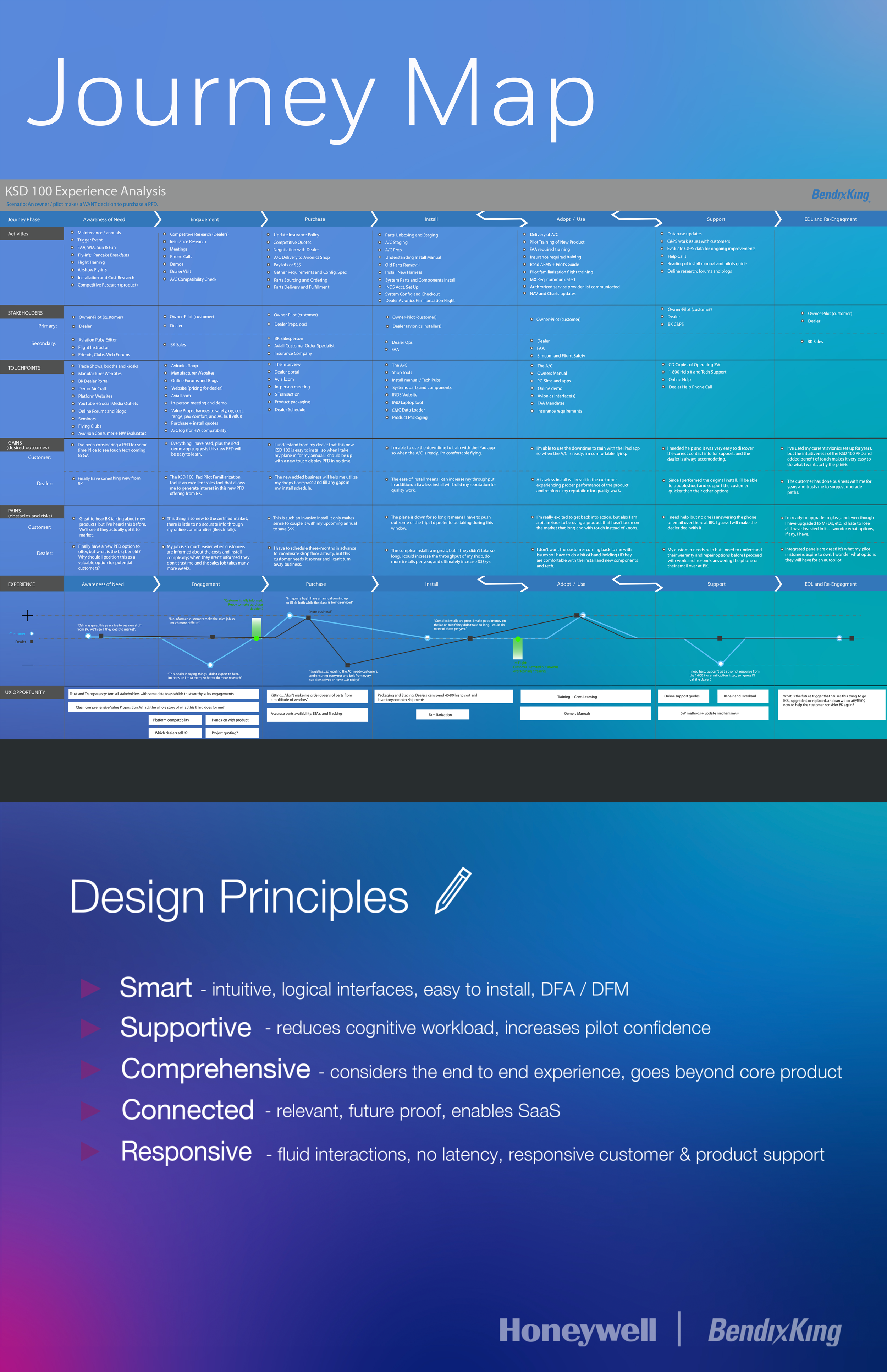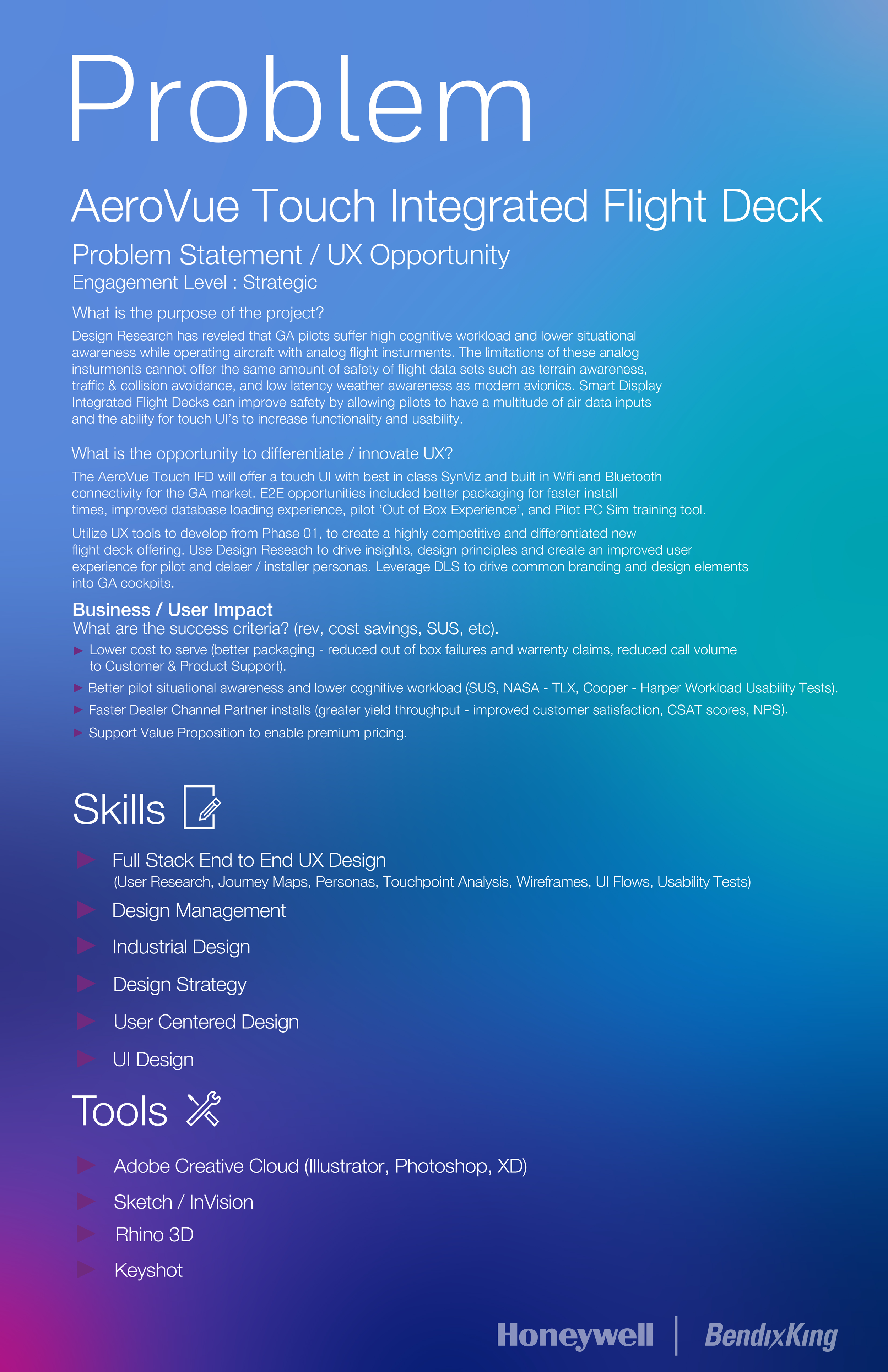Bendix King as a legacy avionics brand had a declining legacy product portfolio and needed new products to accelerate organic growth. I was part of a new business leadership team that was assembled where I built out and lead a UX design team to create new, exciting avionics products for pilots and operators. Enterprise UX design was identified as a key strategic lever to deliver exceptional product experiences and drive organic growth. The result was 7 new products delivered over 3 years. This includes AeroVue Touch IFD resulting in a 27% increase in revenue year over year and 14.6% margin expansion.